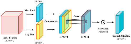 The spatial attention module can highlight key regions in space. The input is the feature map processed by the channel attention module. As shown in Figure 7, first, the input feature map undergoes channel-based maximum pooling and average pooling and the two results are then stitched on the channel. Then, the feature map is downscaled to a single channel using a convolutional network and the spatial attention feature is obtained through a sigmoid activation layer. Finally, the spatial feature map and the original input feature map are multiplied to output the result, which is given by the following equation: