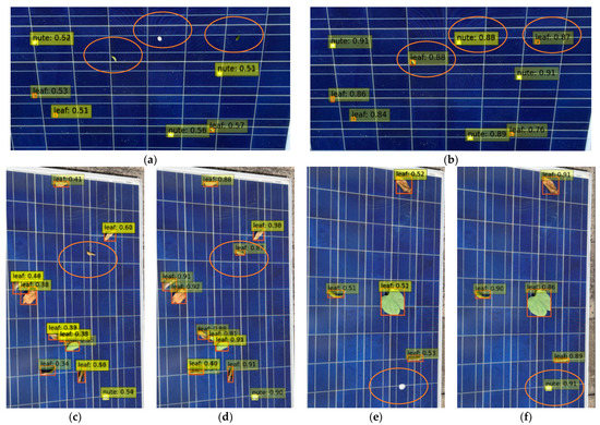 The performance comparison figures of the target detection algorithm contain three categories representing small, medium, and large targets, as shown in Figure 11, where (a) and (b) are the comparison figures of small target detection before and after the application of the advanced algorithm, (c) and (d) are the comparison figures of medium target detection before and after the application of the advanced algorithm, and (e) and (f) are the comparison figures of large target detection before and after the application of the advanced algorithm. Based on the above experimental results, it can be seen that the unimproved model was unable to identify some of the small targets on the surface of the PV module and there were missed detections, which are marked with orange circles in the figures. The advanced model addressed this problem well by eliminating the phenomenon of missed detections and significantly improving the detection success rate for small targets while adequately improving the detection success rate for all sizes of targets. Additionally, the model accurately identified the classes of targets.