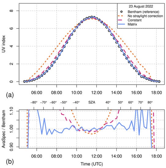 - Kreuter, A.; Blumthaler, M. Stray light correction for solar measurements using array spectrometers. Rev. Sci. Instrum. 2009, 80, 096108. [Google Scholar] [CrossRef] [PubMed]