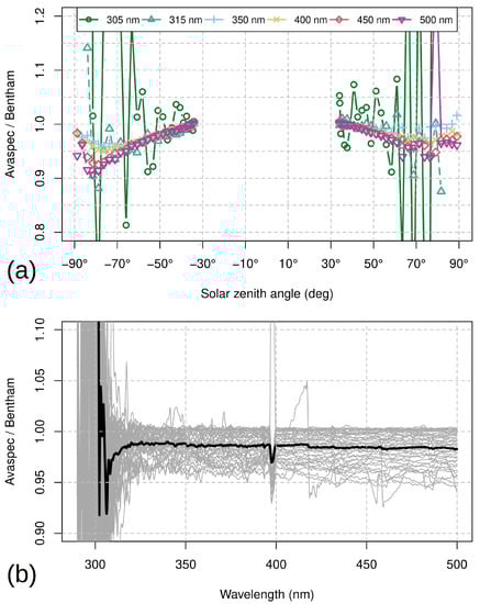 - Zuber, R.; Ribnitzky, M.; Tobar, M.; Lange, K.; Kutscher, D.; Schrempf, M.; Niedzwiedz, A.; Seckmeyer, G. Global spectral irradiance array spectroradiometer validation according to WMO. Meas. Sci. Technol. 2018, 29, 105801. [Google Scholar] [CrossRef]
