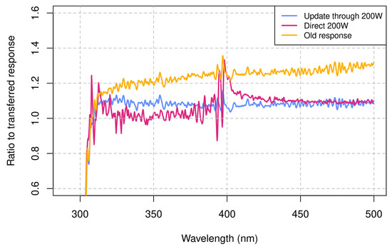 - We demonstrated that in the critical range of 290–500 nm, in which absolute calibration is challenging, the lamps can at least be used in a relative sense, i.e., to check the stability of the instrument and track its spectral variations (Section 4.2);