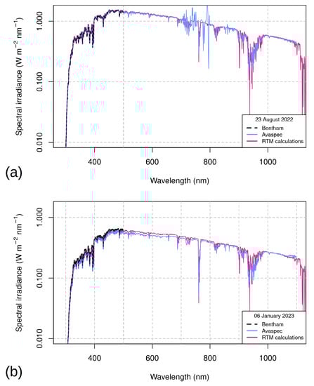 - How good is the agreement between the AvaSpec measurements and the radiative transfer model (RTM) simulations?We performed the spectral simulations with an RTM, providing as input the available ancillary information from co-located instruments. The synthetic spectra were then compared with measurements from the array spectroradiometer. They were also used to compensate the AvaSpec measurements for the unmeasured component of the solar spectrum.