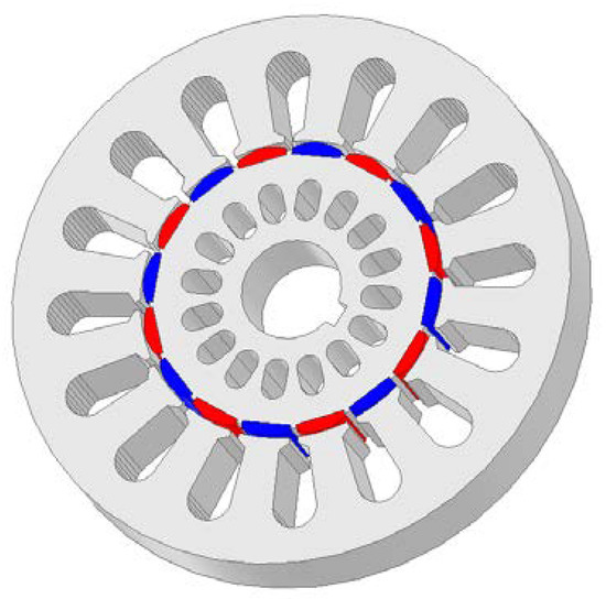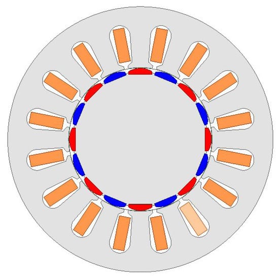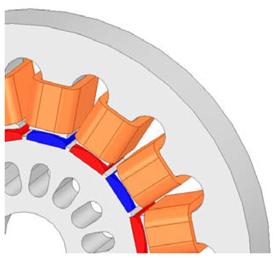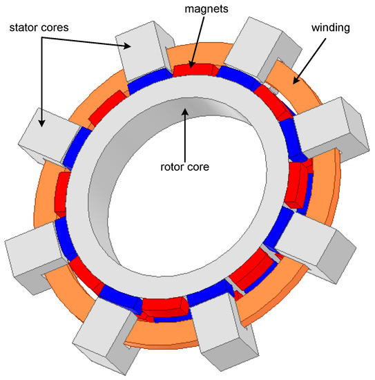 In order to improve the use of the active surface of the magnets and reduce the scattering flux, various variants of the construction described in the literature have been developed [14,15]. The modifications consisted mainly of the use of diagonal cores and the use of extensions at the ends of the cores. These solutions improved the parameters of the machines, but at the same time significantly complicated the construction of the stator cores. In practise, making them would require the use of magnetic powder compounds (MPCs), which are not widely used in the construction of electrical machines.