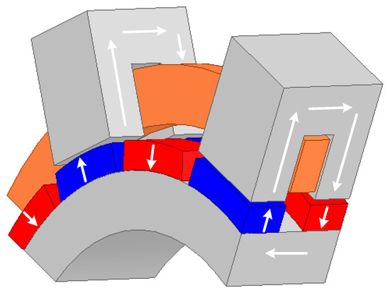 Machines with a transverse field are understood as constructions containing such configurations of electromagnetic circuits in which the force lines of the field mediating energy conversion remain in the plane perpendicular to the direction of motion. Figure 1 shows a general view of a motor segment with a transverse magnetic circuit [8]. Figure 2 shows a fragment of its cross section. The magnetic field lines generated by the permanent magnets on the rotor close through the inverted U-shaped stator cores. These cores encircle the coil, providing magnetic coupling. The number of U-cores is equal to half the number of pairs of magnets placed on the rotor. When the rotor rotates by the pole pitch, the direction of the field lines changes to the opposite one, due to which an alternating electromotive force can be induced in the winding. Due to the alternating flux, U cores must be made of soft magnetic materials. The system shown in Figure 1 should be considered as a segment (part) of the machine that covers its one phase. Several systems of a similar type can be combined to form a two- or multiphase machine.