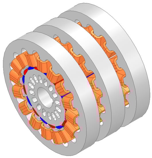 In machines with permanent magnets of a typical structure, the number of pairs of poles is directly related to the increase in the diameter of the stator and rotor; moreover, more optimal power density parameters are obtained for structures with a larger diameter-length ratio [20]. The cogging machine is an unusual design because the machine phases form separate segments placed on a common shaft (Figure 5). The length of this structure, apart from the size of the stator and rotor cores, is also affected by the winding ends, whose axial dimension decreases with an increase in the number of pole pairs. The formulas presented in the following have been derived to capture the relationship between the method of structural division of the cross-section of the cogging machine segment and the moment generated by it. This required the introduction of several simplifications, which, for a specific structure, may result in differences between the values of the torque calculated from the formulas below and those actually generated. In particular, errors may come from the trapezoidal shape of the armature teeth assumed in the model. Magnetic tensions in the yokes were also omitted (μFe = ∞).