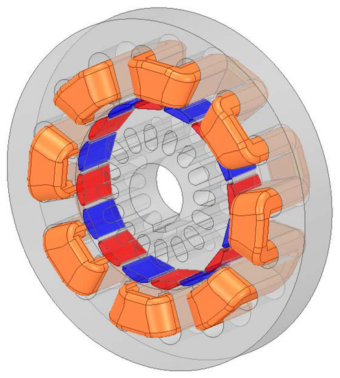 Since in the presented derivation some of the parameters were included in an approximate way, it was necessary to check the discrepancies between the value of the moment determined from the formula and obtained from the calculations on the FEM 3D model. Calculations were carried out for two cases: the cogging machine with the number of pairs of poles pp = 8 and pp = 12. The configurations of both versions are shown in Figure 7 and Figure 8.