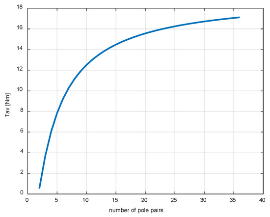 On the basis of the determined dependence, the curve of change of the average torque generated by one segment of the cogging machine was calculated as a function of the number of pairs of poles. All parameters adopted for the calculations are consistent with the assumptions used to verify the torque (Figure 9). The graph is shown in Figure 10.
