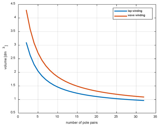 The dependence of the volume of one segment on the number of pair poles for the winding with toothed and wave coils, determined from the Formulas (26) and (28), is shown in Figure 11. As can be seen, the differences between the volumes are quite significant and, as expected, are more significant for configurations with fewer pole pairs. The same design factors were used for the calculations as for determining the dependence of the moment on the number of pole pairs.