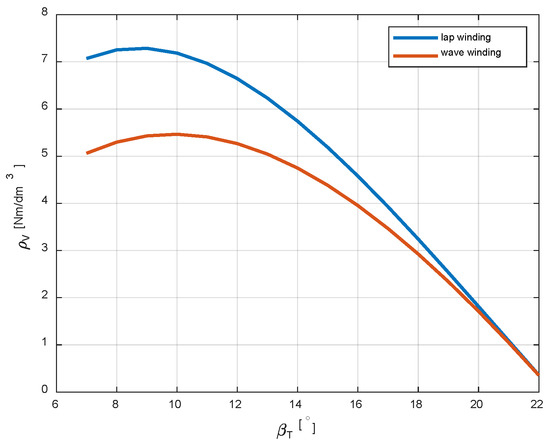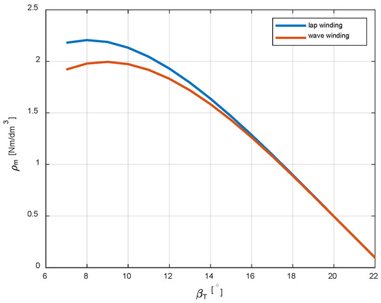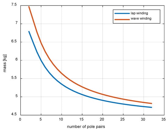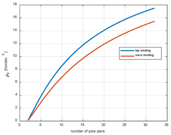 The total weight of the lap and wave windings is similar because the fronts in the first case are located on each tooth on both sides, but their volume is equal to about half the volume of the fronts of the wave winding located on every other tooth (Figure 6). The slight difference in mass is due to the different arc radius of the winding fronts in both cases. When comparing both relationships, it can be concluded that the largest changes in the torque yield from unity of mass and volume are for structures with up to about 15 pair poles. The torque density results for pole pairs greater than or equal to eight are competitive with motors designed for high-power density [10]. The second observation focusses on the advantage of lap winding over wave winding in terms of volume.