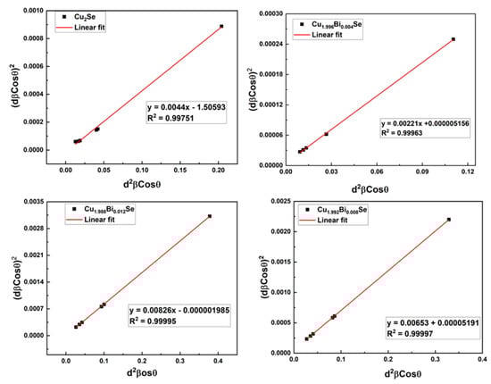 | Bi Content, x | Crystallite Size, D (nm) | Dislocation Density, δ (1015 Lines/m2) | Strain, ε | |||||