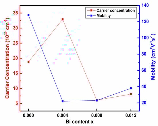 | Bi Content x | Carrier Concentration (1020 cm−3) | Mobility (cm2V−1s−1) |