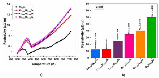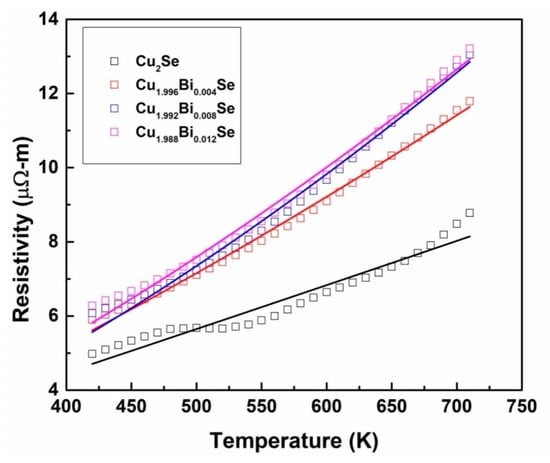| Bi Content (x) | Resistivity (μΩ-m) | Seebeck Coefficient (μV/K) | Power Factor (ΩWm−1K−2) |