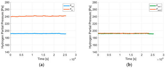 The HPSs positioned in LiPb loop at the inlet and at the outlet of the PAV mock-up measure different partial pressures, as shown in Figure 5a. This difference is due to the PAV mock-up extraction. The hydrogen partial pressure at the outlet of the PAV mock-up is actually measured twice: indeed, two HPSs are installed in two different positions (downstream of the PAV, HLM735, and upstream of the saturator, HLM733; as shown Figure 5b).