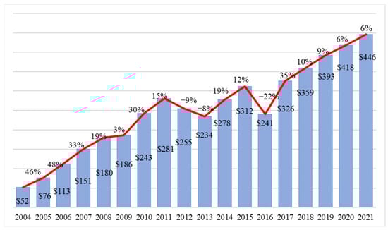 The advantages of clean energy, such as fewer emissions and lower energy input requirements [,] are reflected in renewable energy investment dramatically all over the world. It is also expected to be the fastest growing energy source between now and 2030 []. Based on a Bloomberg New Energy Finance report [], Figure 2 exhibits the total clean energy investment between 2004 and 2021 across the globe. From 2008 onward, clean energy investment became more essential, most probably because of climate change and its different levels of environmental losses []. The total investment in clean energy accounted for USD 543 billion in 2010, reaching USD 755 billion in 2021 (almost a 40% increase). Since global trends indicate that the use of solar, wind, and geothermal energy is effective in avoiding GHG emissions [], determining the effects of GHG emissions on renewable energy investment has become an important issue. When discussing the impacts of CO2 and other GHGs on renewable energy investment, GHGs are the reason for global warming. The greater the GHG emissions, the greater the environmental protection awareness internationally, leading to an increase in clean energy consumption [].