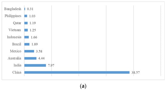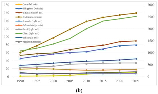 After the 1980s, which coincided with industrial development, CO2 emissions have been accelerated, and non-CO2 GHG emissions continue to grow in both developing and developed countries []. Figure 3 compares the average CO2 and non-CO2 emissions between 1990 and 2021, according to the World Bank []. As can be seen from the figure, countries with a large population (e.g., India and China) have greater CO2 emissions, whereas countries such as Brazil, Indonesia, Australia, Qatar, the Philippines, Bangladesh, Mexico, and Vietnam reported a share of 40–90% non-CO2 emissions in 2021. This indicates that non-CO2 GHG emissions have risen, probably because of less coal usage and higher renewable energy investment []. As large amounts of greenhouse gas emissions have influenced economic [,,,], energy [,], and environmental issues [,], modelers can develop plans for different climate change policies [], depending on which types of GHG emissions are used.