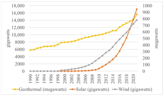 Investment in renewable energy has been followed in many countries, including Australia [], South Korea [], the European Union [], New Zealand [], China [], Croatia [], Poland [], and other regions []. Based on IEA reports [], Figure 4 illustrates the installed capacities of wind, solar, and geothermal energy between 1990 and 2021 on a globe scale. According to International Energy Agency reports, renewable energy investment has increased dramatically and is expected to be the fastest growing energy resource from now until 2030. From the datapoint in REN21 [], a record value of USD 71 billion was invested in solar photovoltaic and wind power, where the share of geothermal and other renewable energy was 4.8% in the United States, 6% in France, 3.2% in Japan, and 16%, 6.5%, 1.7%, and 5.6%, respectively, in Canada, Italy, the United Kingdom, and Germany. By that time, nearly 500 GW had been invested in solar and wind, whereas the installed capacities for geothermal energy were lower at about 15 GW globally in 2018.