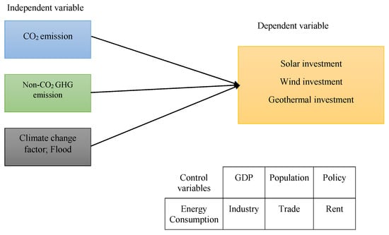 Figure 5 presents the model for the panel data regression based on the relationships between dependent and independent variables. The dependent variables are the left-hand side variables in every model, including Solarit, Windit, and Geothermalit, which represent renewable energy investments. Installed solar, wind, and geothermal capacities are representative of clean energy investment-based gigWatts. The variable i represents the country; it ranges from 1 to N, covering 63 countries, and t shows the time period, ranging from 1 to T, from 1990 to 2021. Independent variables and control variables are selected on the right-hand side. Independent variables such as CO2 and non-CO2 are related to GHG emissions (million tons), whereas Flood (n is an equal number and l is the total loss by flood) is a climate change indicator []. The control variables include Rent (total natural resource rents equals % of GDP), Policy (renewable energy policy), GDP (economic development; constant 2010 USD), Popu (total population), Trade (merchandise trade; % of GDP), Energy (renewable energy consumption), and Indus (industrial structure). εit represents the error terms. Therefore, considering the effects of CO2 and non-CO2 GHG emissions on wind, solar, and geothermal energy investment, the panel data are shown in Equations (1)–(3).