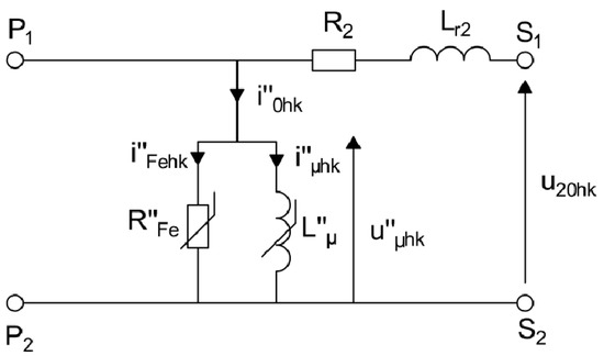 To discuss in detail the idea of the developed, secondary current excitation method used to determine the transformation accuracy of distorted current harmonics by the inductive CTs, their equivalent circuit, presented in Figure 1, is analyzed.