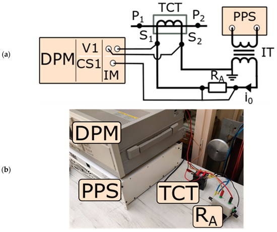 Measuring system (a) and photo (b) of the secondary current excitation method used to determine the current error and phase displacement of the TCT.