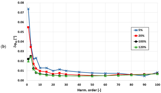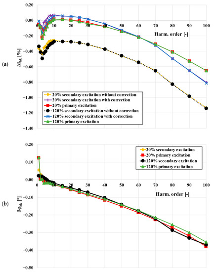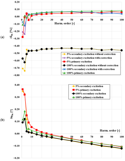 The results of the values of the current error and phase displacement determined for a given harmonic of the tested CT with a rated current ration equal to 1500 A/1 A in the proposed secondary current excitation method and primary reference excitation method are presented in Figure 6. The dotted lines present the results without the consideration of the correction of the secondary winding turns. The method to determine the turns ratio correction of the tested CT is described in paper [25], where its value of considered TCT is equal to six turns. This value changes the current error by 0.4% towards positive values. The results of the tests are presented for the distorted primary current equal to 120% and 20% of the TCT’s rated current value.
