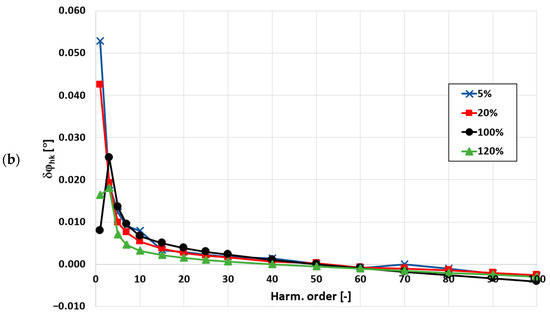 The presented results in Figure 5 indicate that the values of the current error and phase displacement were the highest for the main harmonic of the transformed distorted primary current. They did not exceed −0.05% and 0.06°, respectively.