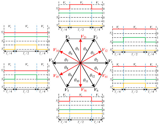 Therefore, the time coefficient λ is selected as 0.5 in this paper, which means that the adjacent odd and even vectors will each act for half of the control cycle to synthesize the desired virtual vectors. On this basis, the six virtual vectors adopted in this paper and their switching sequences are determined, as shown in Figure 4. When the proposed six virtual vectors are used to implement the hysteresis power control of TCIBAR, the ZSV applied to the TCI can remain unchanged, so the zero-sequence current in the TCI will not be out of control under the action of virtual vectors.