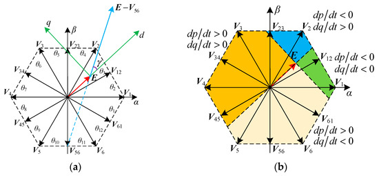 It can be seen from Equation (18) that the active power variation depends on the projection of E−Vmn on the d-axis, while the reactive power variation is determined by the projection of E−Vmn on the q-axis. Therefore, the effect of each virtual vector on the power variation of TCIBAR can be obtained according to the direction and amplitude of the projection of E−Vmn on the d-axis and q-axis. Taking the AC-source voltage vector E in the sector θ3 as an example, the effect of different voltage vectors on the power variation of TCIBAR can be analyzed, and Figure 5a shows the effect of the virtual vector V56. In the meantime, the vector space can be divided into four areas according to the signs of the active and reactive power variation rates, as shown in Figure 5b.