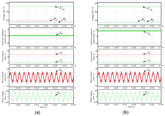 Based on the proposed neutral-point potential control method, the zero-sequence current in TCI can be controlled effectively and stabilized at about 13.5 A, as shown in Figure 13. Besides, it can be seen that the voltage balance between the bipolar DC ports of the TCIBAR can still be maintained under unbalanced load condition. Therefore, combining the virtual-vector switching table and the neutral-point potential control method, the proposed VVB-DPC strategy can realize the effective control of the TCIBAR and has good steady-state performance even under unbalanced load conditions.