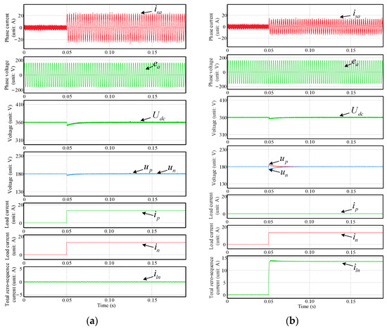 The simulation results under unbalanced load condition are shown in Figure 8, where only the negative DC port of TCIBAR is connected with a 13.3 Ω resistor. To better demonstrate the effect of the proposed neutral-point potential control method, the simulation results with and without the neutral-point potential control are presented in Figure 8a,b for comparison. It can be seen from Figure 8 that the proposed neutral-point potential control method can effectively eliminate the voltage imbalance between the bipolar DC ports under unbalanced load conditions.