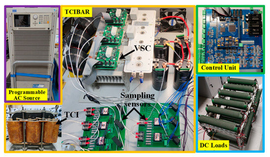 In order to verify the feasibility and effectiveness of the proposed VVB-DPC strategy, an experimental prototype of the TCIBAR is established in the laboratory, as shown in Figure 10. The digital signal processor (DSP) TMS320F28335 is selected as the main control chip of the control unit, and the sampling frequency is set as 20 kHz. The rated parameters of the experimental prototype are the same as those listed in Table 6. In the experimental prototype, the positive and negative port capacitances are designed based on the requirement of voltage drop suppression during load step, and the filter inductance is selected to reduce the high-frequency harmonics of the phase current. Meanwhile, the self-inductance and mutual inductance of the TCI are designed to meet the demands of low power loss and fast dynamic response of zero-sequence current [18]. In addition, a three-phase programmable AC source is used to generate the three-phase source voltages instead of a generator.