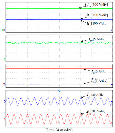 Next, in order to research the steady-state performance of the neutral-point potential control method in the proposed VVB-DPC strategy, the experiments under unbalanced load condition have be performed on the prototype of the TCIBAR. Meanwhile, to create the unbalanced load condition, only the negative port of the TCIBAR carries a 13.3 Ω resistive load, while the positive port is unloaded. The experimental results before and after the adoption of the proposed neutral-point potential control method under unbalanced load condition are shown in Figure 12 and Figure 13, respectively.