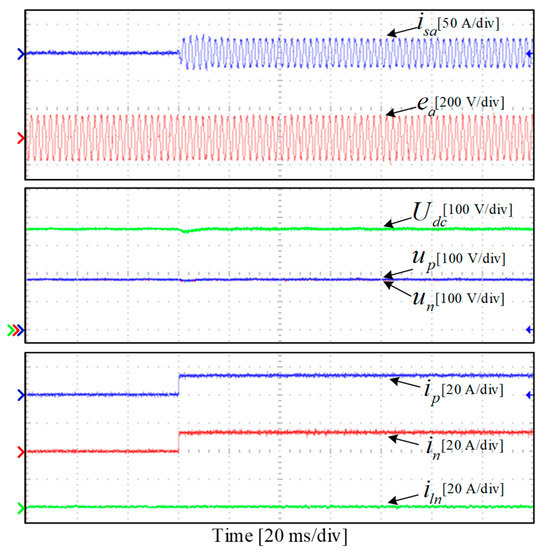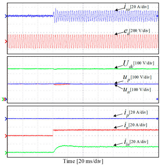 The experimental results of the balanced step loads are shown in Figure 14. As can be seen, when the balanced step loads are connected to the bipolar DC ports of the TCIBAR, a voltage drop of about 16 V occurs on the DC bus. Owing to the proposed VVB-DPC strategy, the TCIBAR can respond immediately and increase the phase currents in time to realize the fast tracking of the load power. As shown in Figure 14, the DC bus voltage drop caused by the step loads can be compensated within 20 ms, and the DC bus voltage is restored to the rated value. Meanwhile, during the whole dynamic process, the TCIBAR can maintain the voltage balance between the positive and negative ports, and the total zero-sequence current iln can be controlled at 0 A stably.