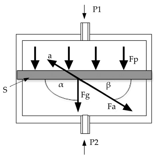 Functional diagram of classic pressure transducer: S—elastic membrane; Fp—pneumatic force; Fa—dynamic acceleration force; β—angle between the membrane and dynamic acceleration force; Fg—membrane weight; α—angle between the membrane and membrane weight; p1—pressure applied to the pressure side; p2—pressure applied to the vacuum side.