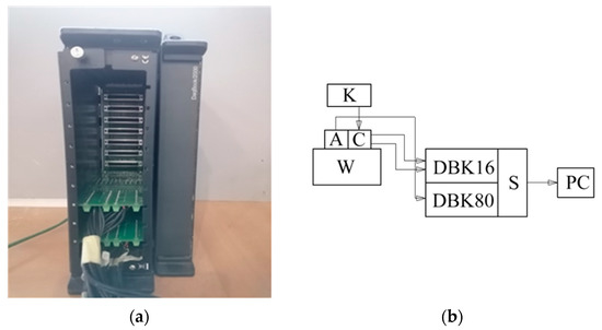 Compiled measuring system: (a) completed DaqBook 2001 measurement computing system equipped with expansion cards; (b) transducer test block diagram for harmonic excitations (K—FLUKE718 1G pressure calibrator; W—adjustable vibrating table; A—ADXL accelerometer; C—tested transducer; S—DaqBook 2001 measurement system + DBK41 expansion module + DBK16 strain gage expansion card + DBK80 differential voltage input card with excitation; PC—computer with DasyLab 2020 software).