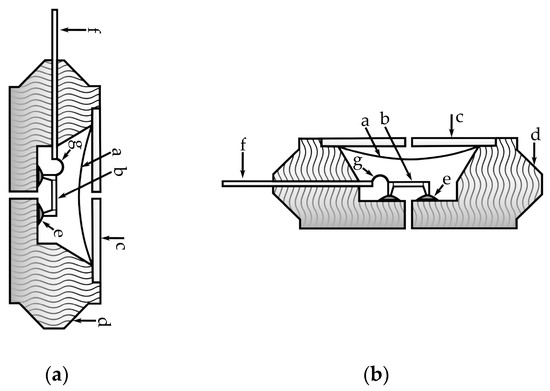 MEMS technology pressure sensor cross-section: a—protective gel cover; b—silicon membrane; c—metal part of the cover; d—main cover; e—measuring the structural place of the attachment; f—signal output; g—pins [2].