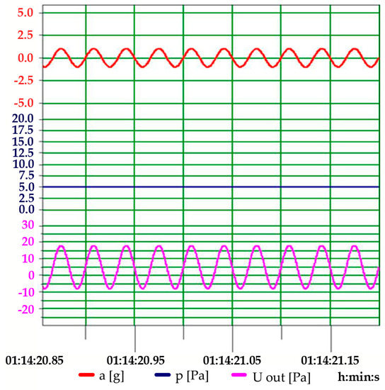 The subsequent waveforms from the experiment are shown in Figure 10, where the dynamic acceleration was forced by vibrations with an amplitude of 5 g and a frequency of f = 10 Hz, Uout was the output signal from the converter (which was scaled in Pascal), and the pressure was p = 5 Pa.