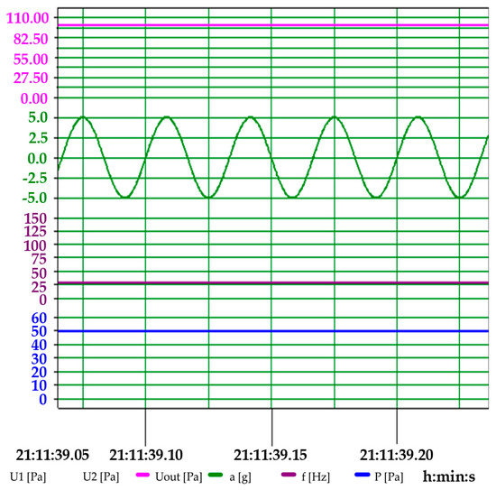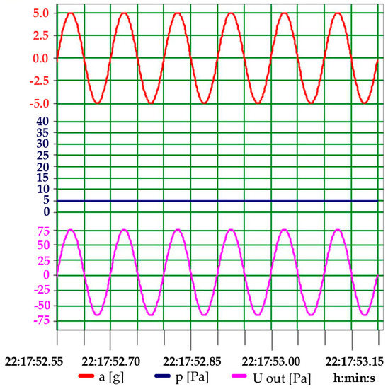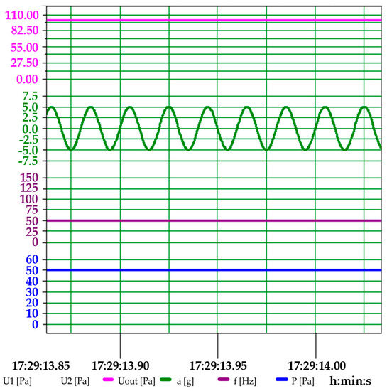 The next waveforms from the experiment are shown in Figure 9, where the dynamic acceleration was forced by vibrations with an amplitude of 1 g and a frequency of f = 30 Hz, Uout was the output signal from the converter (which was scaled in Pa), and the pressure was p = 5 Pa. In this system configuration, the output signal should have been 5 Pa because of the applied reference pressure at the transmitter inputs. The values on the Uout curve varied from Uout max = 18 Pa to Uout min = −8 Pa, resulting in an RMS value of Uo(Rms) = 10 Pa.