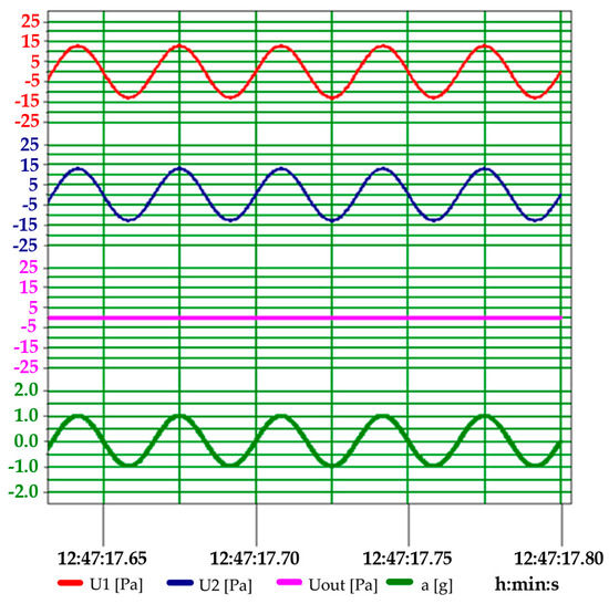 Figure 16 shows the waveforms of the output signals from individual membranes U1 and U2 and total output signal Uout for the harmonic with a = 5 g excitation. It can be seen that the pressure values from the individual membranes were modulated by the vibration signal changing its value within a range of −70 to 70 Pa, while the output signal from the transducer showed a constant value of 10 Pa. This was double the reference pressure of 5 Pa (as shown in Formula (10)).