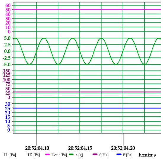Figure 17 presents the results of the transducer tests for the set pressure value from the pressure calibrator with a value of P = 5 Pa (blue line) for the amplitude and frequency of the set vibrations with values of a = 5 g (green line) and f = 30 Hz (purple line), respectively, in the form of graphs. The response of the transducer was Uout = 10 Pa (pink line). It can be seen from the graph that the vibrations to which the transducer was subjected did not affect the constant output signal. The output signal was equal to double the value of the measured pressure according to Equation (10).