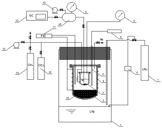 Shen et al. [11,12] constructed an experimental device for testing the solubility of CO2 in pressurized LNG based on the static analysis method. The pressure-resistant reactor is placed in a thermostatic bath wrapped with heating tape, and the thermostatic bath is placed in a liquid nitrogen dewar. In addition, the cold nitrogen volatilized by the liquid nitrogen provides cold energy, and the temperature is adjusted by the heater. Xiong [13] improved on this and used the apparatus to perform gas–solid-phase equilibrium (SVE—solid–vapour equilibrium) experiments of CO2 in natural gas. The experimental apparatus built by Riva et al. [14] added a pneumatic RORSI sampler compared to that of Shen et al. and studied the effect of nitrogen and oxygen on the solubility of CO2 in methane liquid and vapor at low temperatures. Sampson et al. [15] built a small high-pressure- and low-temperature-tolerant visualization device using flowing liquid nitrogen to provide cooling and temperature regulation by a heater. They used this device to perform constant pressure-cooling solidification experiments of benzene in methane at low temperatures and obtained the kinetics of benzene solid formation in methane.