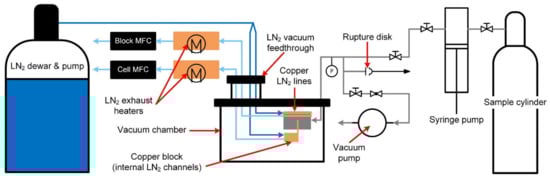As shown in Figure 2, the small visualization device built by Sampson et al. [15] has a volume of 3.5 mL and a working pressure of up to 20 MPa. It is placed in a large-volume vacuum chamber, and the liquid nitrogen dewar with a liquid nitrogen pump provides it with flowing liquid nitrogen. The bottom of the kettle is fitted with a copper block connected to an internal copper finger that provides a subcooling point for the observation of the solid phase. The kettle wall and the copper block each have a temperature control system that includes a mass flow controller at the cold nitrogen outlet to control its flow rate, a heater, and a temperature controller connected to the heater.