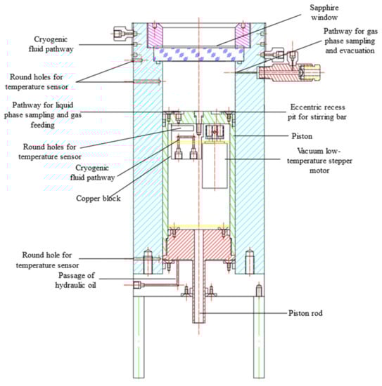 - Based on the existing device and the experimental requirements, we propose an improvement of the design of the device functions, such as increasing the pressure-bearing capacity, visualization, continuous sampling, variable volume, and stirring. The minimum working temperature of 77 K, the design pressure of 20 MPa, and the maximum working volume of 300 mL were selected based on the above requirements.