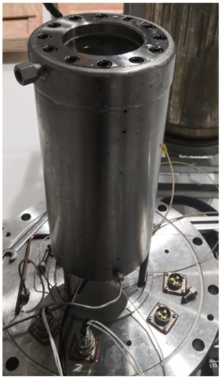 Six Pt100 resistance temperature sensors (RTDs) are used to measure the temperature. These temperature sensors are mainly located in the measuring cell and the copper block, as shown in Figure 8. Two temperature sensors connected to the temperature controller are located on the outside of the kettle wall and in the copper block; the other four sensors are located on the inside of the kettle wall, on the inside of the lower end of the kettle wall, in the copper cold finger, and at the bottom of the measuring cell. The temperature sensor on the inside of the kettle wall is used to indicate the temperature inside the measuring cell of the reactor. The temperature sensor on the inside of the lower part of the kettle wall is located close to the hydraulic oil channel and is used to measure its temperature. The main purpose of the temperature sensor at the bottom of the cell is to be used in conjunction with the copper cooling finger temperature sensor to ensure that the copper cooling finger temperature is always slightly below the bottom of the cell, providing an effective subcooling point. The temperature sensor model is PT100, range is 73–373 K, and testing accuracy ±0.1 K, with a 4–20 mA output.