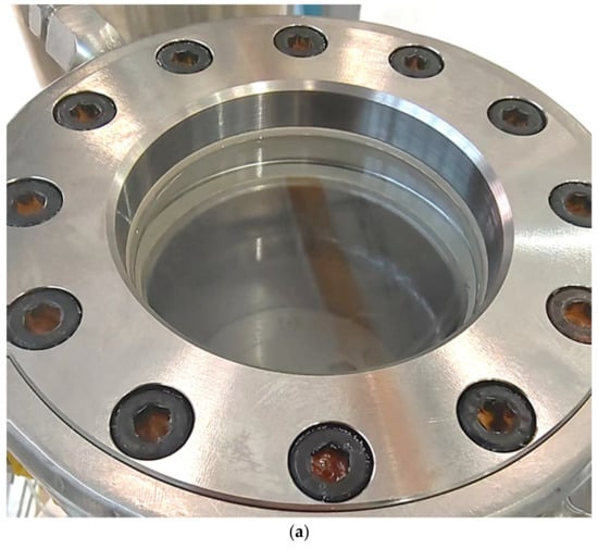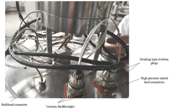 The vacuum level (usually about 0.05 mbar) prevents condensation/freezing outside the reactor and helps to ensure reliable temperature control, so the vacuum chamber should be well-sealed. When a leak occurs in the reactor during the experiment, resulting in a sharp increase in pressure inside the kettle to the point of kettle destruction, the vacuum chamber is needed as a buffer to mitigate the danger, so the vacuum chamber should have a certain pressure resistance. The design of the vacuum chamber is made of 2205 duplex stainless steel [22] with a pressure resistance of 5 Mpa, and the thickness of the sapphire glass in the top cover of the vacuum chamber is 5 mm according to the strength calculation. The rupture disc is set on the vacuum tank as a safety measure, and the sealing part adopts a low-temperature- and high-pressure-resistant elastic accumulator ring. The bottom part is electrically connected (sensor, heater, and stepper motor) by vacuum feedthroughs consisting of low-temperature- and high-pressure-resistant high-pressure-sealed lead connectors and butt-type airline plugs. The gas feed line and LN2 line connection is realized through the through-plate connector of the top and bottom flange of the vacuum tank. The vacuum feedthroughs and feedthrough joints for the bottom flange of the vacuum tank are shown in Figure 6.