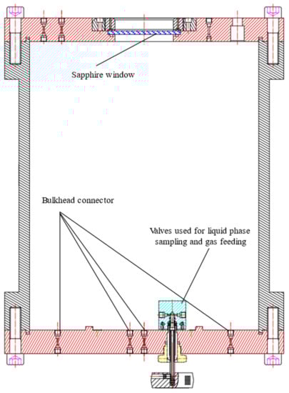 This paper foresees the design of a comprehensive device that has sufficient volume to ensure that continuous sampling does not disrupt the equilibrium that has developed inside the device, as in the device in Figure 1. On the other hand, the device will be able to withstand high pressures up to 20 MPa, as in the device in Figure 2, and we will be able to observe the liquid–solid equilibrium experiments through a window. In addition, a variable volume function was added to broaden the scope of use of the experimental setup. The improved design and the corresponding parameter selection will be described in Section 3.
