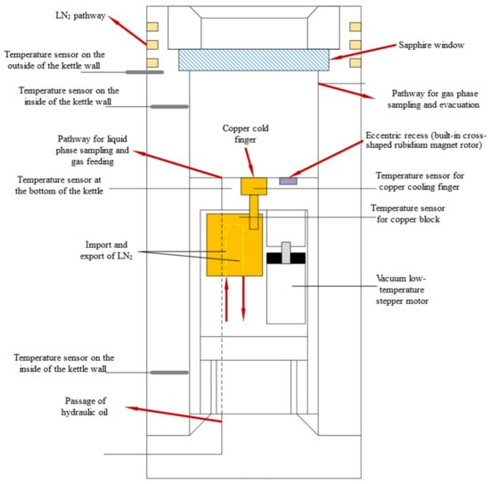 - The temperature control system includes the temperature controller, temperature sensor, and heater, which is responsible for the realization of two independent temperature control systems. The measurement system includes the temperature sensor, pressure sensor, paperless recorder, and gas–liquid sampling system. For the above measuring elements and heating elements, the line enters from the flange at the bottom of the vacuum tank into its interior. In order to ensure the pressure and sealing conditions of the vacuum box, as well as the normal operation of the temperature control system and the measurement system, special connection methods should be adopted. For the gas-phase sampling, because it is carried out at room temperature, it is only necessary to rely on the air pressure or pumping device in the kettle to make the gas enter the detection instrument or sampling bag; for the liquid-phase sampling, relying on the pressure and gravity in the kettle to flow into the buffer, the cryogenic liquid will rapidly vaporize and increase the pressure, so the buffer should also have a certain pressure-bearing capacity.