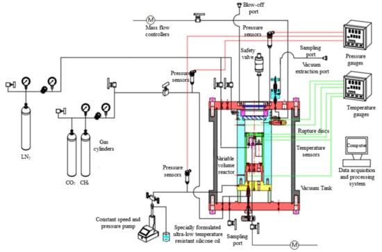 This section describes the specific design of the experimental setup and the main components of the system for studying the liquid–solid-phase equilibrium experiment of CO2 in PLNG at low temperature and high pressure, including the imaging system with a visualization of the reactor, the vacuum chamber, the temperature control system, and the measurement system.