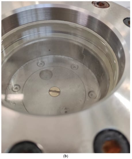 Compared with the small visual liquid–solid-phase equilibrium device designed in Reference [12], the device not only expands the volume to 300 mL, but also increases the piston and realizes the variable volume function. In Figure 11, Figure (a) shows the image when the piston is at the lowest position, and Figure (b) shows the image when the piston reaches a certain position. When the piston is at the lowest position, the volume of the reactor is 300 mL. When the pressure requirement is not met during the experiment, the piston can be driven by low-temperature hydraulic oil to achieve a fine adjustment of the pressure. In addition, when the volume of the reactor is not suitable and affects the experimental results, the volume of the reactor can be adjusted up and down by the piston.