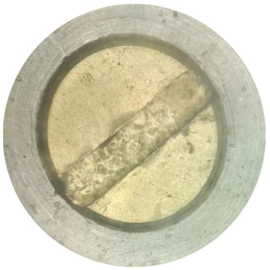 Compared with the liquid–solid-phase equilibrium apparatus in the literature [8,9,10,11], the experimental apparatus designed in this paper has an additional sapphire window through which the interior of the kettle can be observed. The liquid–solid-phase equilibrium experiment of CO2 in PLNG under low temperature was carried out using this apparatus. After the methane and carbon dioxide are introduced into the kettle, the liquid nitrogen outlet valve is opened for cooling. At the beginning of cooling, the mass in the kettle is still in a gas state. At this time, the image in the reactor can be obtained as shown in Figure 12, and the surface of the copper cooling finger can be clearly observed. When the temperature and pressure conditions in the kettle reach equilibrium after cooling for a period of time, the carbon dioxide solid precipitates, as shown in Figure 13.