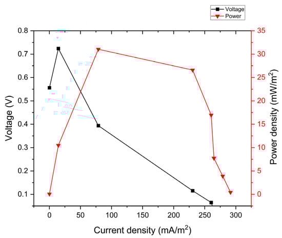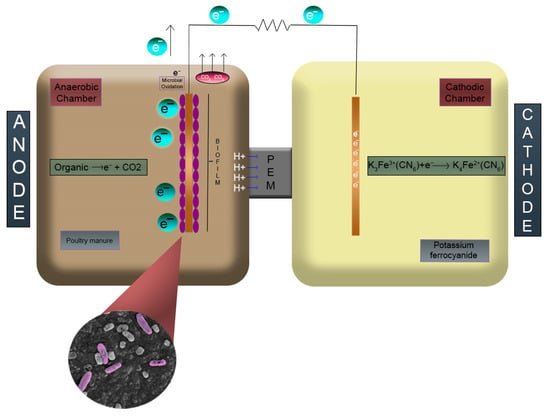 Electrogenic bacteria oxidize organic matter and release electrons that are transferred to the anode, this is evidenced by the generated electricity [,]. It is of great importance to consider the conditions of the substrate, its characteristics, and its components to generate electricity []. Poultry substrate waste is a powerful organic substrate within MFC, due to the amount of feed that generates a high voltage in the initial stage of operation as reported in [,,] who obtained maximum power densities of 220 mW/m2 and 287.5 mW/m2 for poultry substrate waste and for different concentrations of wastewater from poultry manure.